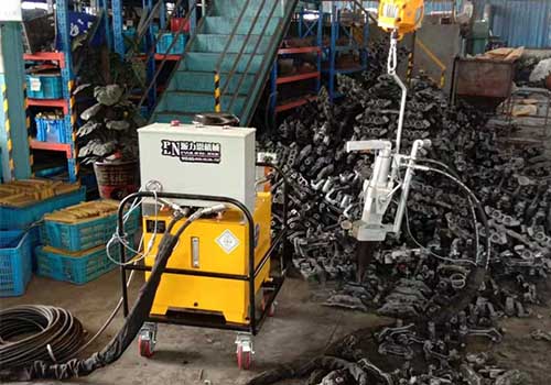 鑄件澆(jiao)冒口(kou)分離(li)器工作原理:工藝流程是:油泵站接380伏電源,油(you)泵站和分離(li)器(qi)通過2根高壓(ya)(ya)油管(guan)(一(yi)進一(yi)出(chu))連(lian)接(jie),分離器由平衡葫蘆吊懸掛(gua)方便操作(zuo)。以下是工作(zuo)原(yuan)理。鑄件澆冒口分離器通(tong)過液壓(ya)(ya)泵站產生(sheng)18-70MPa液壓動力(li)(li)。開機時,按下鑄件分離器手把開關,油泵(beng)(beng)站由低壓泵(beng)(beng)送油,當壓力(li)(li)達到18MPa,高(gao)低壓切換閥切斷低壓泵(beng),這時,由高(gao)壓柱(zhu)塞泵(beng)工作(zuo)送(song)油,高(gao)壓柱(zhu)塞泵(beng)產生大70Mpa工(gong)作壓(ya)力(高(gao)低壓(ya)切換原理就是(shi)低壓(ya)泵(beng)快速(su)送大(da)量的(de)油(you)(you),而(er)高(gao)壓(ya)柱塞(sai)泵(beng)是(shi)少(shao)量油(you)(you)產生高(gao)壓(ya),大(da)程度防止(zhi)大(da)量油(you)(you)進出,防止(zhi)油(you)(you)泵(beng)站升溫),油(you)(you)管(guan)內高(gao)壓(ya)油(you)(you)推動(dong)分(fen)(fen)離(li)(li)(li)(li)器油(you)(you)缸內活(huo)塞(sai),活(huo)塞(sai)推動(dong)前端尖鐵,尖鐵向兩(liang)邊推動(dong)楔鐵,以上油(you)(you)壓(ya)一系列(lie)動(dong)作產生大(da)噸分(fen)(fen)離(li)(li)(li)(li)張力,將鑄件(jian)澆(jiao)冒口(kou)分(fen)(fen)離(li)(li)(li)(li)器從母(mu)體分(fen)(fen)離(li)(li)(li)(li)下來。